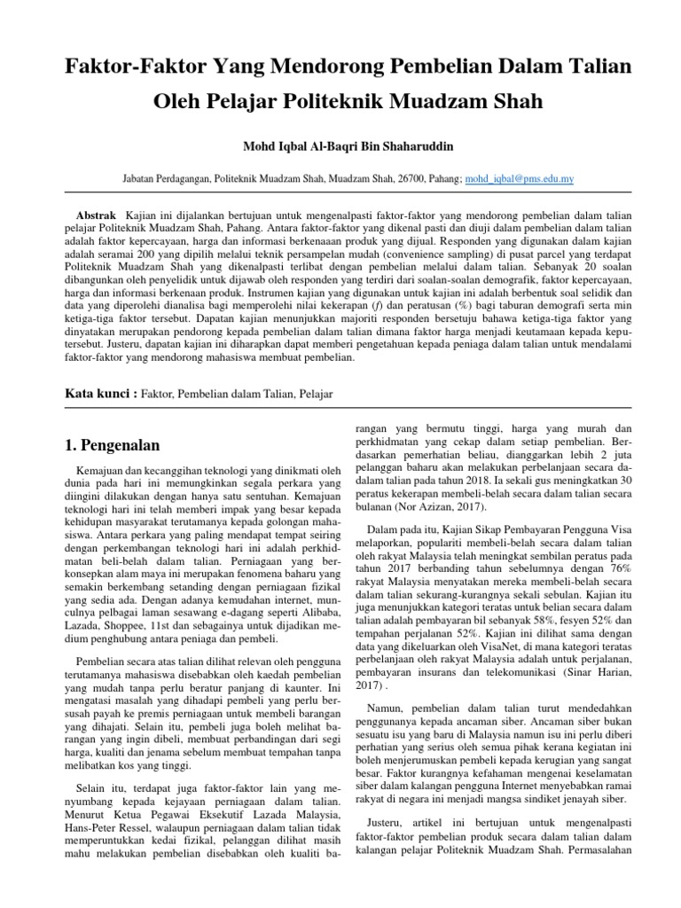 Faktor Faktor Yang Mendorong Pembelian Dalam Talian Oleh Pelajar Politeknik Muadzam Shah Pdf